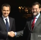 Tras un primer apretón de manos y el intercambio de unos breves comentarios con referencia incluída al sorteo de Navidad, en medio del frío de la mañana que había dejado un manto de escarcha en los jardines de la Moncloa, ambos posaron para los informadores gráficos. Cuando Zapatero y Rajoy se disponían a acceder al edificio aceptaron el requerimiento de fotógrafos y cámaras de televisión para estrecharse de nuevo las manos