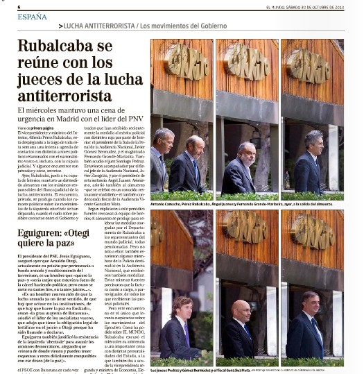 Tal y como refleja el diario El Mundo, Rubalcaba y el 'número 2' de Interior almorzaron este viernes con los máximos representantes de la cúpula judicial en la lucha contra el terrorismo. A saber: el presidente de la Audiencia Nacional, Ángel Juanes, el fiscaol jefe, Javier Zaragoza y los magistrados Gómez Bermúdez, Grande Marlaska y Pedraz.