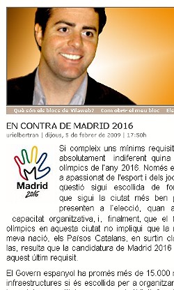(Libertad Digital) En este caso ha sido un diputado de ERC en el Parlamento catalán, Uriel Beltrán, el que tal y como señala el diario E-Noticias escribía un artículo en su blog en el que trata de explicar que la concesión de las Olimpiadas a Madrid perjudicaría "a mi ciudad, Badalona, y a mi nación, los Países Catalanes".