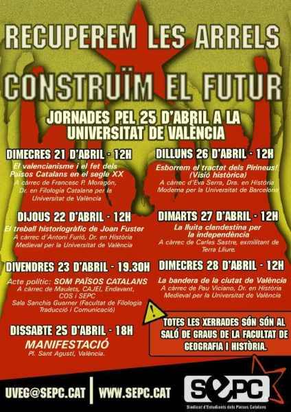 El Sindicato de Estudiantes de los Países Catalanes (SEPC) organiza desde la pasada semana, y hasta el final de la actual, un ciclo de conferencias en la Universidad de Valencia con la autorización de las autoridades académicas. La gran mayoría de ellas tienen como temática principal el proselitismo político y la reivindicación de la Comunidad Valenciana como supuesta parte de la quimera de los Países Catalanes.
