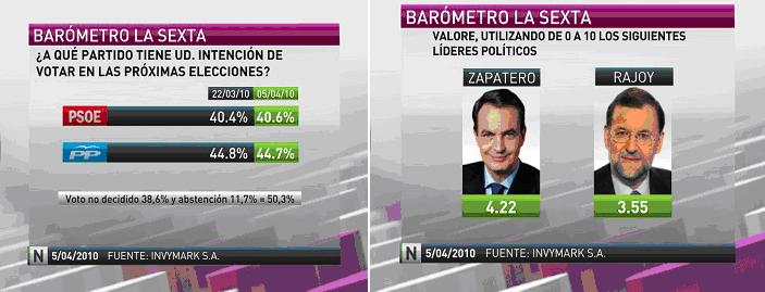 Estos datos pertenecen a El Barómetro de La Sexta, la televisión de Jaume Roures, fundada, entre otros, por Miguel Barroso, ex secretario de Estado de Comunicación del Gobierno Zapatero entre abril de 2004 y septiembre de 2005 y marido de la actual ministra de Defensa, Carmen Chacón.