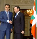 Zapatero recibió a Ibarretxe en las escaleras de acceso al edificio del Consejo de Ministros en el complejo de la Moncloa, donde se desarrollará la entrevista y cuya entrada estaba flanqueada por la bandera española y la denominada ikurriña.