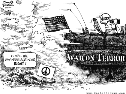 Atropellado por el tanque "Guerra contra el terror" comandado por los votantes... Demócrata: Ha sido por el matrimonio homosexual, ¿verdad? © 2004 Cox & Forkum