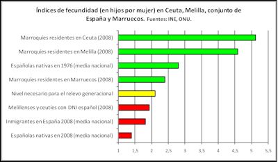 Un buen amigo, melillense de pro, sostiene que la mejor garantía de la españolidad de Melilla es su propia población magrebí, que con la anexión a Marruecos perdería el nivel de vida y los servicios públicos de que goza actualmente. Curiosamente, la fecundidad de las marroquíes residentes en Melilla y Ceuta es el doble de la de las que viven en Marruecos, lo que intensifica aún más la marroquización demográfica de nuestras ciudades norteafricanas (Nota bene: en Estados Unidos llaman "bebés-ancla" a los niños que tienen los inmigrantes ilegales en territorio norteamericano para intentar quedarse allí. ¿Hay algo de esto aquí?).
