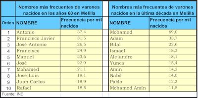 La infecundidad colectiva de los españoles, que pone en grave riesgo su bienestar a medio y a largo plazo, y equivale a un auténtico suicidio demográfico a cámara lenta, comporta un peligro añadido en Melilla y Ceuta: facilita sobremanera que ambas dejen de ser territorio español. Si la población española envejece de forma inexorable por la mayor esperanza de vida y nuestra raquítica natalidad (33 años era la edad promedio de los españoles en 1975, por 41 años en 2009), ya está menguando en muchas provincias (20 de las 50 en 2009, y la cosa va a peor), y es sustituida de forma progresiva por inmigrantes y los hijos de éstos (entre los que figuran más del 20% de los bebés españoles actuales, y cerca del 40% en provincias como Gerona, donde alrededor de uno de cada ocho recién nacidos tiene madre marroquí), en Ceuta y Melilla se está produciendo una marroquización acelerada del paisanaje. Testigo de cargo de esta mutación son los nombres de los niños que nacían y nacen por allí, como se aprecia en la tabla adjunta, relativa a Melilla.