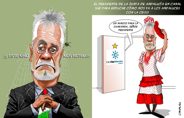 Ni en sus peores pesadillas, José Antonio Griñán pudo prever el destino cruel que le preparaba la historia. Nacido el 7 de junio de 1946, Griñán, de no dedicarse a la política, sería realmente un pensionista. En junio de este año cumplirá 66 años. Que el PSOE andaluz presente como candidato a la presidencia de la Junta a este jubilado de oro explica con mayor claridad que el mejor de los discursos es el afán de renovación de aquel socialismo que nació en Suresnes y que ayer se resistió a morir. Inicialmente, un técnico procedente de familia ultraconservadora, franquista-falangista, fue derivando hacia el socialismo hasta incorporarse a la Junta de Andalucía, muy especialmente, en el área sanitaria aunque era, profesionalmente, Inspector de Trabajo. De ahí, y poco a poco, llegó a ser viceconsejero de la Junta, consejero, ministro, otra vez consejero y finalmente, Presidente de la Junta. Ayer fue elegido presidente del PSOE, como dicen en Cádiz, de "cagalástima", como concesión de Rubalcaba el victorioso a Chacón la perderiosa, que podría haber dicho Borges. (Viñeta cedida por Canalsú, Andalucía Imparable)