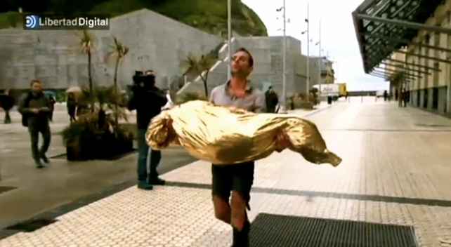 Como si hubiera sufrido los efectos de una explosión: con la ropa destrozada, chorreando sangre por múltiples heridas abiertas y un cadáver en brazos cubierto por una manta térmica. Así paseó el artista Omar Jerez por el casco viejo de San Sebastián, haciendo escala en los lugares en los que la ETA asesinó a tres personas, dos empresarios y un político, sin evitar en su trayecto las covachuelas donde entonces se celebraban aquellos crímenes y hoy se trata a sus autores como héroes defensores de la paz. También hoy, como entonces, la indiferencia de una sociedad ya irrecuperable para la decencia, cuyos miembros prefirieron mayoritariamente hace décadas ser un rebaño estabulado por el nacionalismo antes que ciudadanos libres dispuestos a vivir con dignidad.