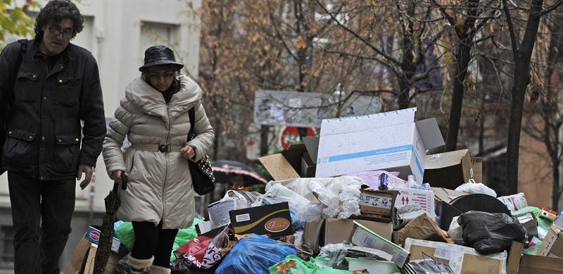 Basura, y esta por toneladas, la que llena las calles de Madrid, esparcida por las aceras que parece que la hayan sembrado. Una basura con ingredientes peculiares –¿de dónde ha salido tanta ropa?– y en muchas ocasiones junto a papeleras y contenedores vacíos, cuando no quemados.