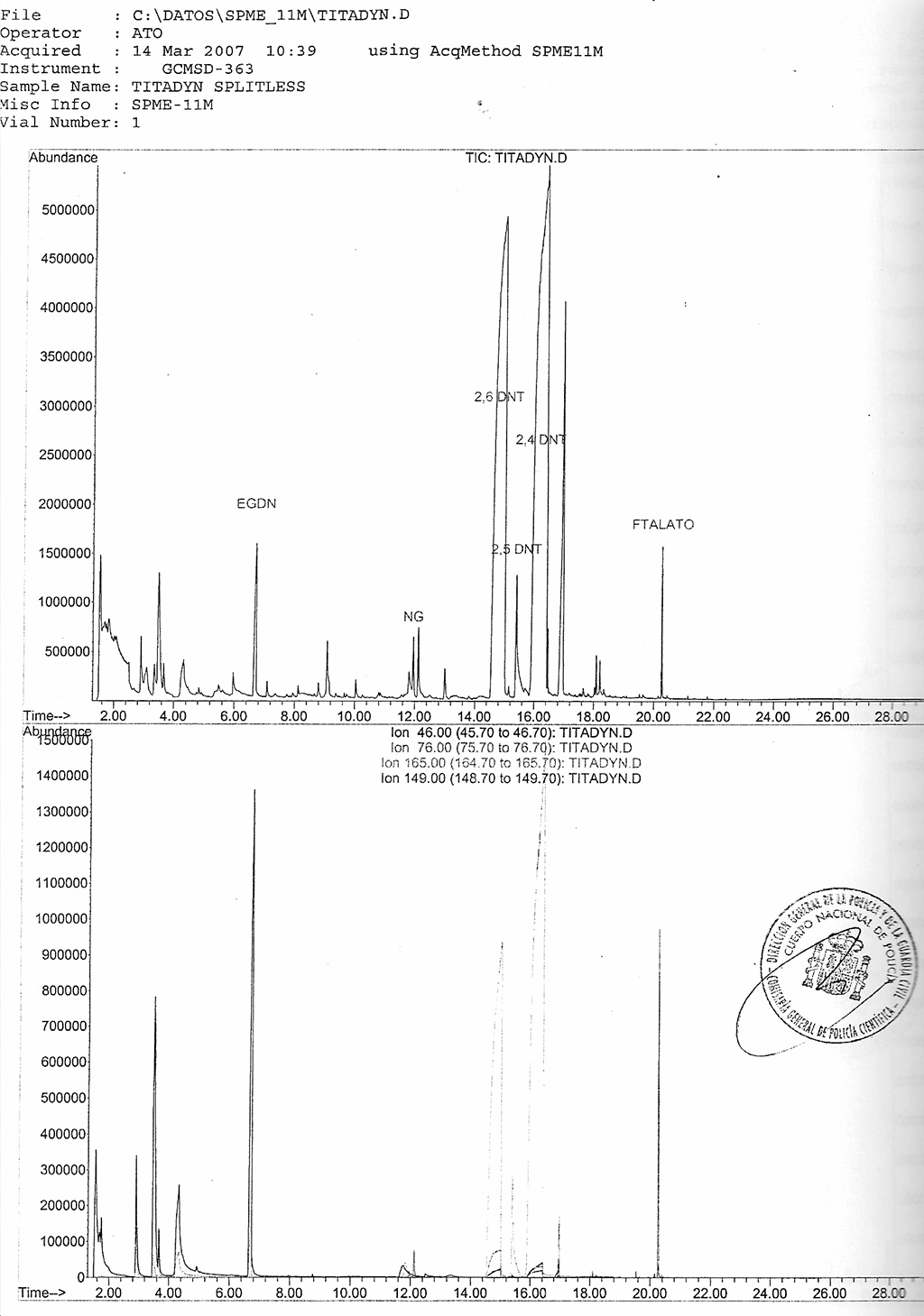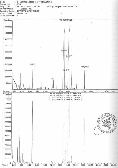 Cromatograma de Titadyn procedente de muestra incautada a la ETA. El pico que aparece, con la denominación genérica de FTALATOS en un tiempo de retención de 20,02 corresponde, según la base de datos del software al dibutilftalato, DBF, lo que demuestra que este compuesto no es específico de la Goma 2Eco.