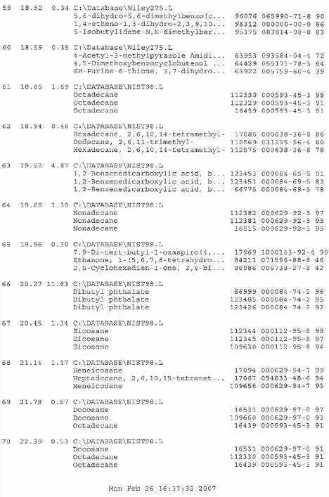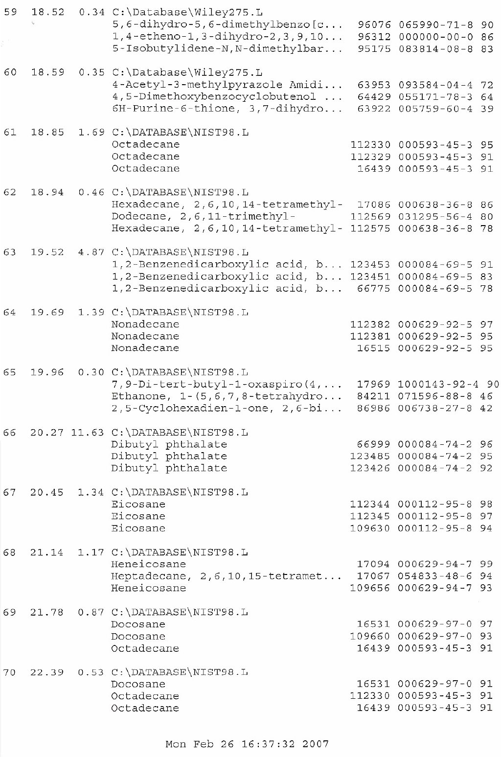 Base de datos NIST 98.L mostrando de modo explícito el tiempo de retención del dibutilftalato a 20,27 minutos que el operador, perito oficial, englobó sin destacarlo con la denominación genérica de FTALATOS en las Figuras 1 y 2.