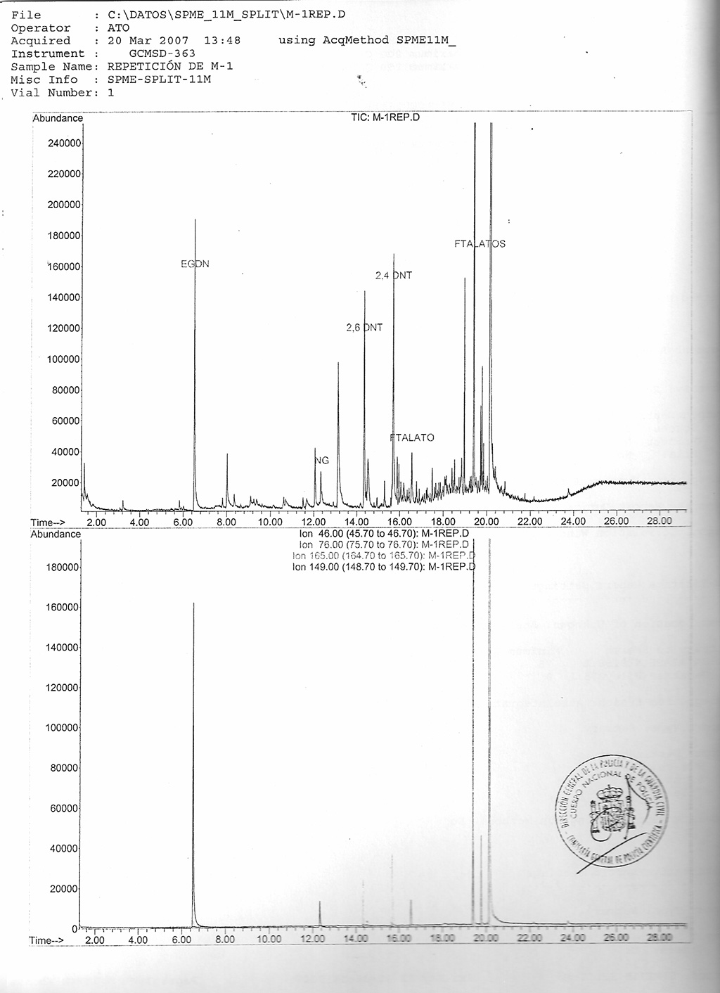 Cromatograma de la muestra M-1. Se aprecian los picos correspondientes a Nitroglicerina y 2,4 DNT y 2,6 DNT característicos de Titadyn. Aparece, en la gráfica superior, bajo la denominación genérica de FTALATOS, el dibutilftalato (DBF) en el tiempo de retención de en torno a 20 minutos. Se observa con más precisión en la Figura 2.