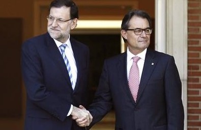 Como si Jordi Pujol no llevara años encabezando la política separatista de su partido, como si no hubieran cogido robando a toda su familia, como si no hubiera confesado que desde que llegó al Poder se ha dedicado a robar –con Hacienda de estafermo- a los mismos ciudadanos a los que aleccionaba en moral católica y ética nacionalista, como si esa confesión no demostrara que una clave en la radicalización separatista de la Generalidad de CiU ha sido que la dinastía política más corrupta de Europa y parte de América no entre en la cárcel, como si esa confesión no desnudara la miseria de la "construcción nacional" de Cataluña y la consiguiente destrucción de España… en suma, como si Pujol no hubiera dicho nada y como si lo confesado nada supusiera en la política catalana y española, el presidente del Gobierno Mariano Rajoy ha recibido a Artur Mas con todo respeto y consideración, otorgándole el rango simbólico de Jefe de Estado (fórmula inaugurada por Zapatero con Ibarreche y criticadísima entonces por el PP) posando sonrientes junto a las banderas de España, Cataluña y la Unión Europea, todas del mismo tamaño, tirando a liliputiense. Para esconder la española, hay que demediar el conjunto. Parecía un adorno de mesa.