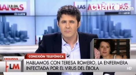 El caso es que, dentro de una bacanal de titulares disparatados, fotos "de las redes sociales" en las portadas cuyo interés informativo es cero y que suponen una pavorosa intromisión en la intimidad de la enferma, noticias "por confirmar" y disparates varios, la palma se la ha llevado sin duda la entrevista que Jesús Cintora ha realizado en directo a la enfermera Teresa.