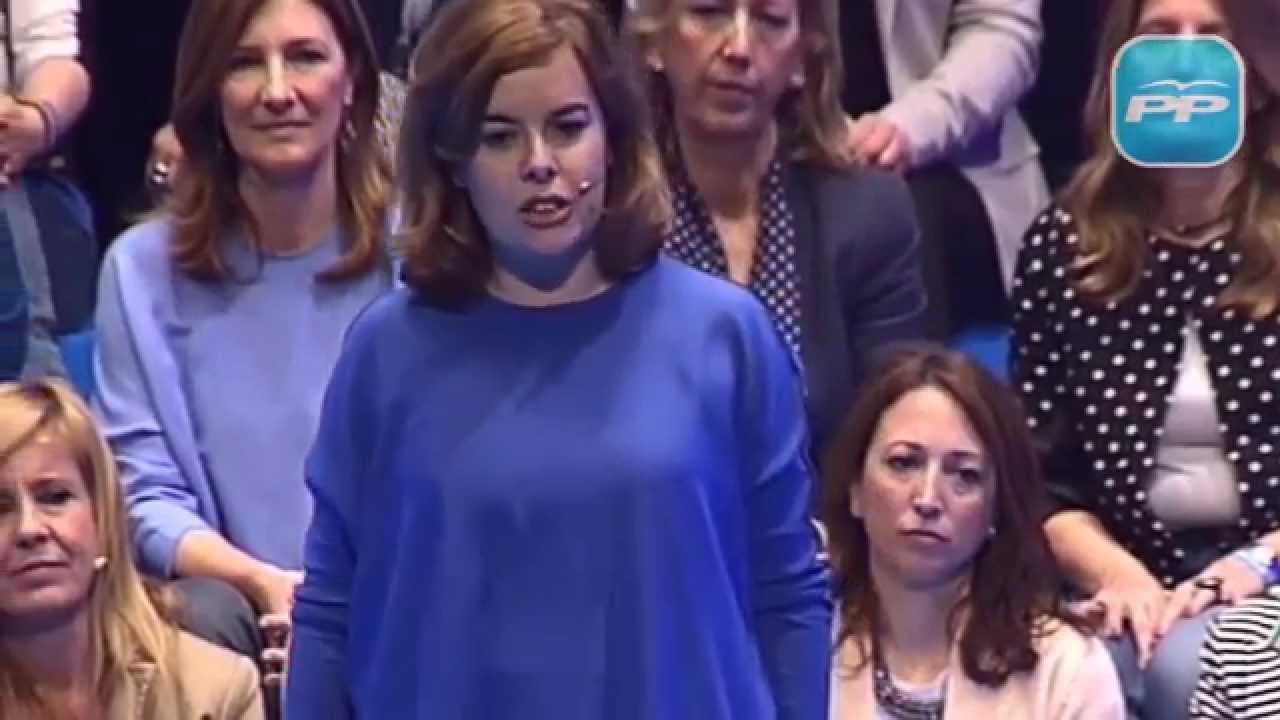 Sáenz de Santamaría salió al escenario con un micrófono integrado para poder gesticular con mayor comodidad. Ni siquiera necesitó un atril, sino que se puso delante del público a cuerpo gentil sin más elementos de distracción que una blusa azul pitufo, un par de tonos más oscuro que el conocido azul PP.