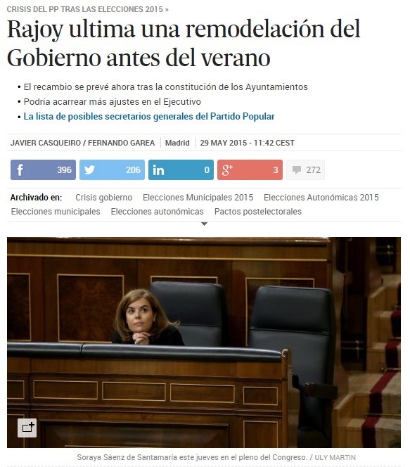 En El País colocan a Cospedal como ministra de Cultura al quedar vacante por iniciativa propia la cartera de José Ignacio Wert. Aun si fuera cierto, demuestra que Rajoy es incompatible con la reacción, con el movimiento. Conseguiría apartar a la secretaria general porque se le presenta la posibilidad de un intercambio. Del partido nacional y del castellano-manchego al Gobierno, lógicamente como castigo. Unos dicen que ella se negará; otros, que no está ni mucho menos planteado. El caso es que lo publicaba El País ilustrando la noticia con una foto de Soraya en su escaño, sola, sin Rajoy al lado.