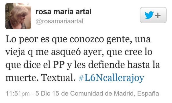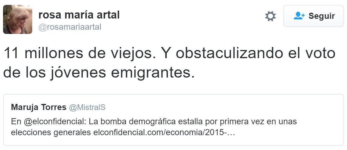 La sexagenaria gacetillera, que ahora escribe en eldiario.es de Nacho Escolar, tiene, paradójicamente, muy mala opinión sobre los viejos. Lean dos tuits suyos: