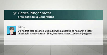 El presidente de la Generalitat de Cataluña, Carles Puigdemont, publicó el domingo un tuit en que se mofaba del fracaso de Ciudadanos en las elecciones del País Vasco y de Galicia. Éste era el comentario en cuestión: