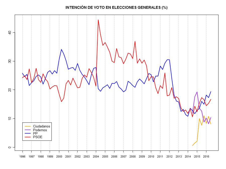En segundo lugar, porque es, precisamente, la pérdida de transversalidad lo que explica, en gran medida, el deterioro posterior que ha venido sufriendo en los sondeos. Así, mientras que en octubre de 2014 menos del 40% de los encuestados identificaba a Podemos con un partido de extrema izquierda, el pasado mayo, antes de las segundas elecciones generales, ese porcentaje ascendía al 52%, según el CIS. De hecho, tan sólo el 11% de los españoles ubica hoy a Podemos en el centro político, frente al 55% del PSOE. En una escala de 1 a 10, siendo uno izquierda y 10 derecha, los votantes otorgan a Podemos una posición ideológica de 2,19 puntos, mientras que el PSOE obtiene 4,6, en línea con la definición media de la mayoría de españoles (4,67).