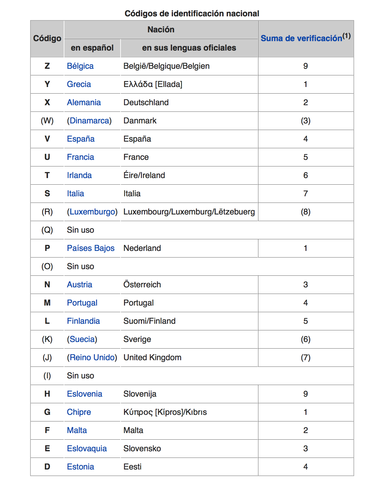 Se incluyeron países que no están en la eurozona. La única letra disponible actualmente es la "A", ya que la "Q", la "O" y la "I" se descartaron para no generar confusión.