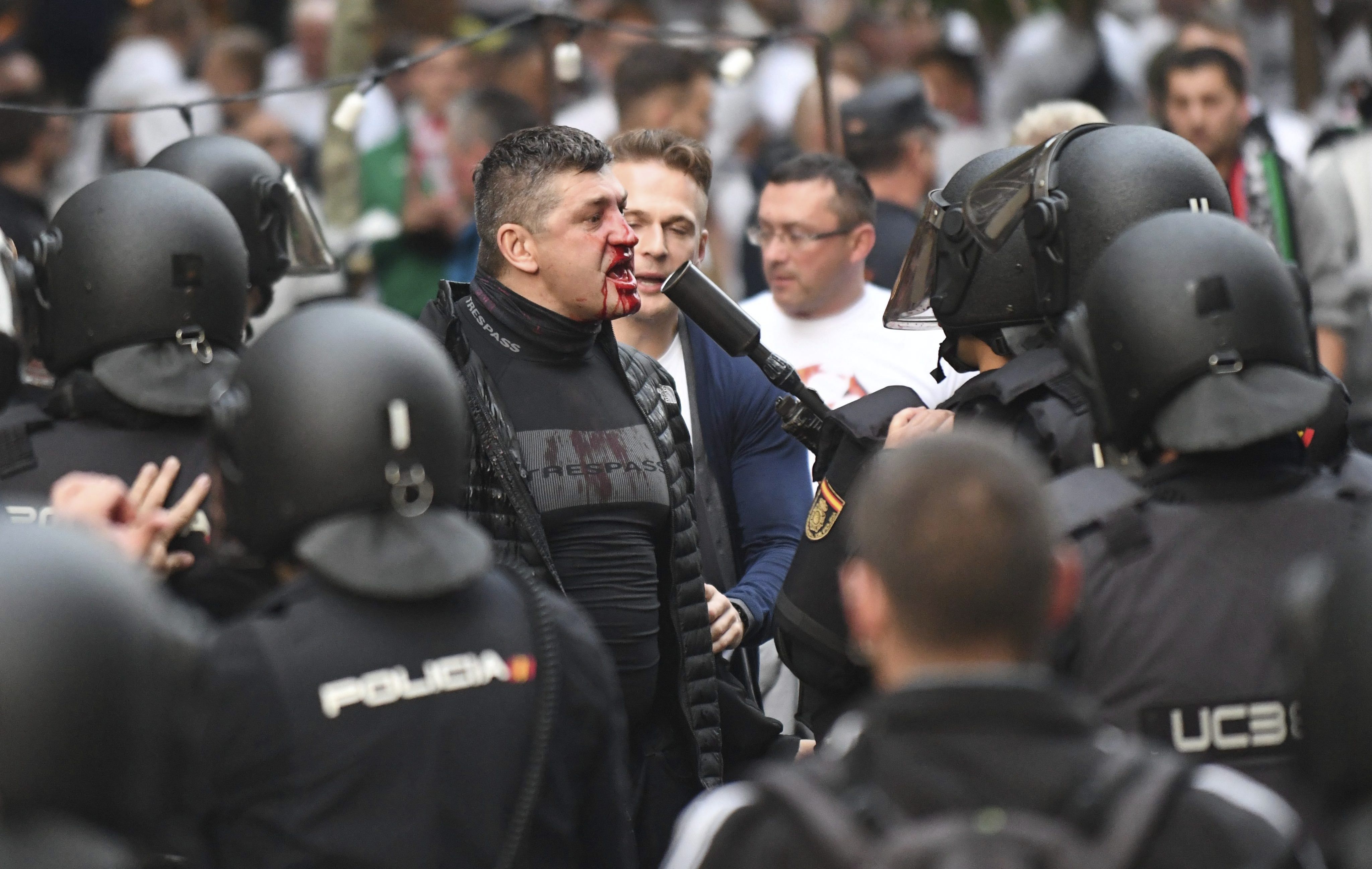 El hombre que aparece en la fotografía es uno de los doce aficionados polacos detenidos este martes. Ese hombre, con la cara ensangrentada, atacaría un par de segundos después a varios policías bien armados, protegidos y que le superaban claramente en número. Ese hombre, que parece no temer a nadie, es uno de los líderes de la grada del Legia de Varsovia y, sin que yo fuera consciente de su identidad y de su objetivo, iba a ser mi acompañante de viaje por las zonas más céntricas de Madrid. Incluso íbamos a compartir asientos en un vagón de metro en el que el único español, además de la policía, era el que escribe estas líneas.