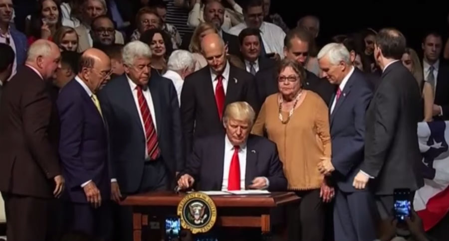 Ya en el recinto, De Fana y Cary fueron conducidos por los servicios de protocolo al escenario, donde ocuparon dos de los nueve asientos allí reservados, yendo a sentarse en los otros siete dos miembros del gabinete de Trump, el secretario de Trabajo Alexander Acosta, el gobernador Scott, el vicepresidente Pence, el senador Marco Rubio y el congresista Mario Díaz-Balart, arquitectos los dos últimos de la nueva política exterior de los Estados Unidos con Cuba, infinitamente más firme que la de Obama, y que es lo que el presidente había ido a firmar allí. La consigna protocolaria fue que, tan pronto Trump sacase su pluma del bolsillo de la chaqueta, los nueve del escenario, Angelito de Fana entre ellos, se levantaran de sus asientos y le rodeasen. Trump firmó. El fotógrafo disparó. Y el resto ya es historia. Historia de la buena.