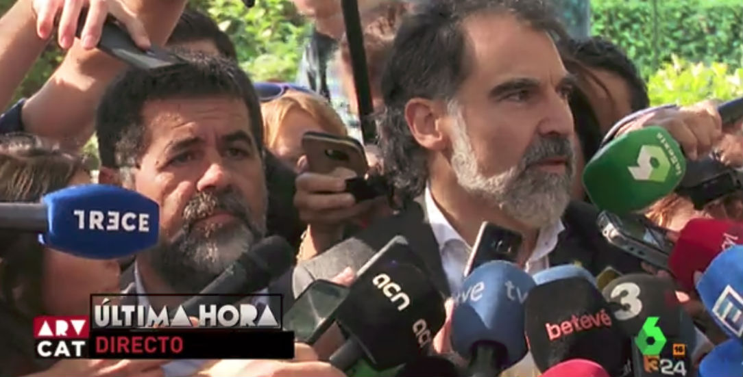 Sánchez y Cuixart, Cuixart y Sánchez, esos Jordis a la sombra que vienen a ser algo así como Los Morancos del procés, una inseparable pareja artística empleada a tiempo completo en la promoción de algaradas callejeras con cargo al erario público. Al punto de que cuando la noche de autos ordenaron al alimón el ataque contra los vehículos y los agentes de la Guardia Civil en la Consejería de Junqueras, decenas de agitadores identificados como miembros de la ANC y de Òmnium repartieron durante un par de horas bocadillos y latas de refrescos entre la turba asaltante; viandas y bebidas distribuidas gratis total, huelga decir. Tan iguales en su común y temeraria inconsciencia sobre los efectos penales de los gravísimos delitos que estaban cometiendo, Sánchez y Cuixart, sin embargo, responden a tipos humanos muy distintos entre sí. Mucho más anodino y vulgar Sánchez, algo que se refleja incluso en lo abotargado de su estampa física y el tosco aliño indumentario con que logra empeorarla. Más sugerente y complejo Cuixart, a diferencia de su cuate, el abúlico profesional del agit prop, un fanático iluminado, un verdadero creyente, un loco por la causa.
