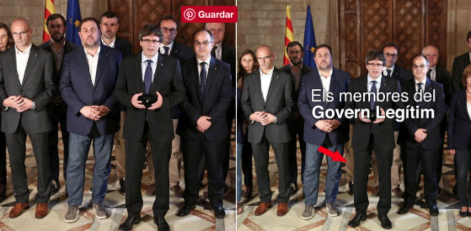 Pero a veces algunos beneméritos políticos tienen la gentileza de regalarnos imágenes que simbolizan de tal manera sus palabras, obras y omisiones que cualquier argumento sobra. La última ha sido, naturalmente, la maravillosa alineación del Govern legítim con la pierna ectoplásmica del traidor Santi Vila como eterna recordación de la chapuza falsificadora. ¡Desde aquí se oyen las carcajadas del padrecito Stalin al ver que sus discípulos catalanistas son incapaces de llegar con el sofistícadísimo Photoshop a los extremos de orwellianización fotográfica alcanzados en sus añorados días con medios artesanales!