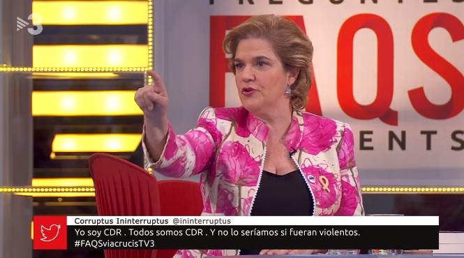 La imprescindible Pilar Rahola, autora de la biografía de Mas El rey Arturo, conductora en TV3 del espacio Hola, Rahola, columnista estrella de La Vanguardia y consejera de cabecera de Puigdemont, considera que los CDR son "un movimiento cívico, transversal y con gente de buena fe". "