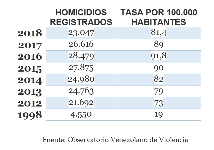 En 2012, último año completo de Chávez, ya que murió en marzo de 2013, los homicidios perpetrados fueron 21.693 según el OVV. En 2013 en Irak, país en guerra, murieron casi 10.000 personas, pero en Venezuela se duplicó esa cifra, con casi 25.000. 2016 ha sido hasta ahora el año más sangriento, con cerca de 29.000 homicidios y una tasa de 91,8 muertos por 100.000 habitantes. En 2018, el siniestro registro bajó a 23.047. Más de 60 asesinatos al día de media.