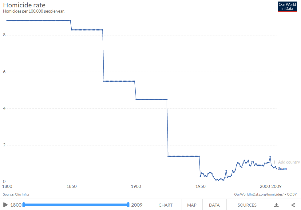 Sin embargo, la frialdad de los datos arroja, de nuevo, una realidad bastante diferente de la que difunden la mayoría de medios y partidos. España, por suerte, no es un país violento ni, mucho menos, machista, en el que las mujeres deban temer por su seguridad e integridad física. Para empezar, porque tanto en España como a nivel global el número de homicidios se ha desplomado en los últimos siglos. Nunca antes el mundo ha sido tan seguro como en la actualidad.
