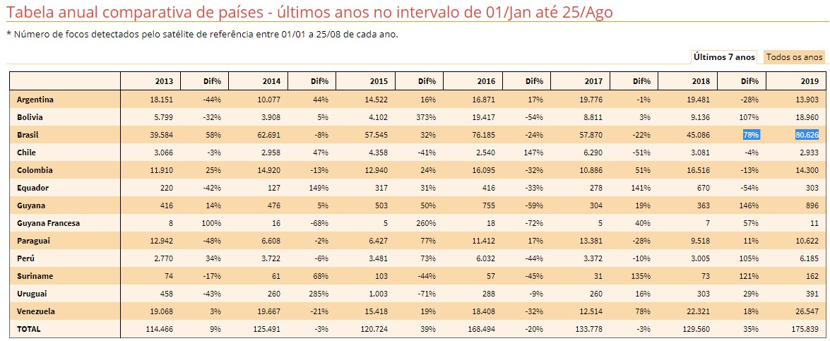 Por otro lado, si bien este cierto que el número de focos detectados en Brasil se ha disparado un 78% interanual en lo que va de 2019, hasta algo más de 80.000, según registros oficiales, en Bolivia el aumento ronda el 107% y en Perú un 105%, sin que nadie, sin embargo, haya activado la voz de alerta.