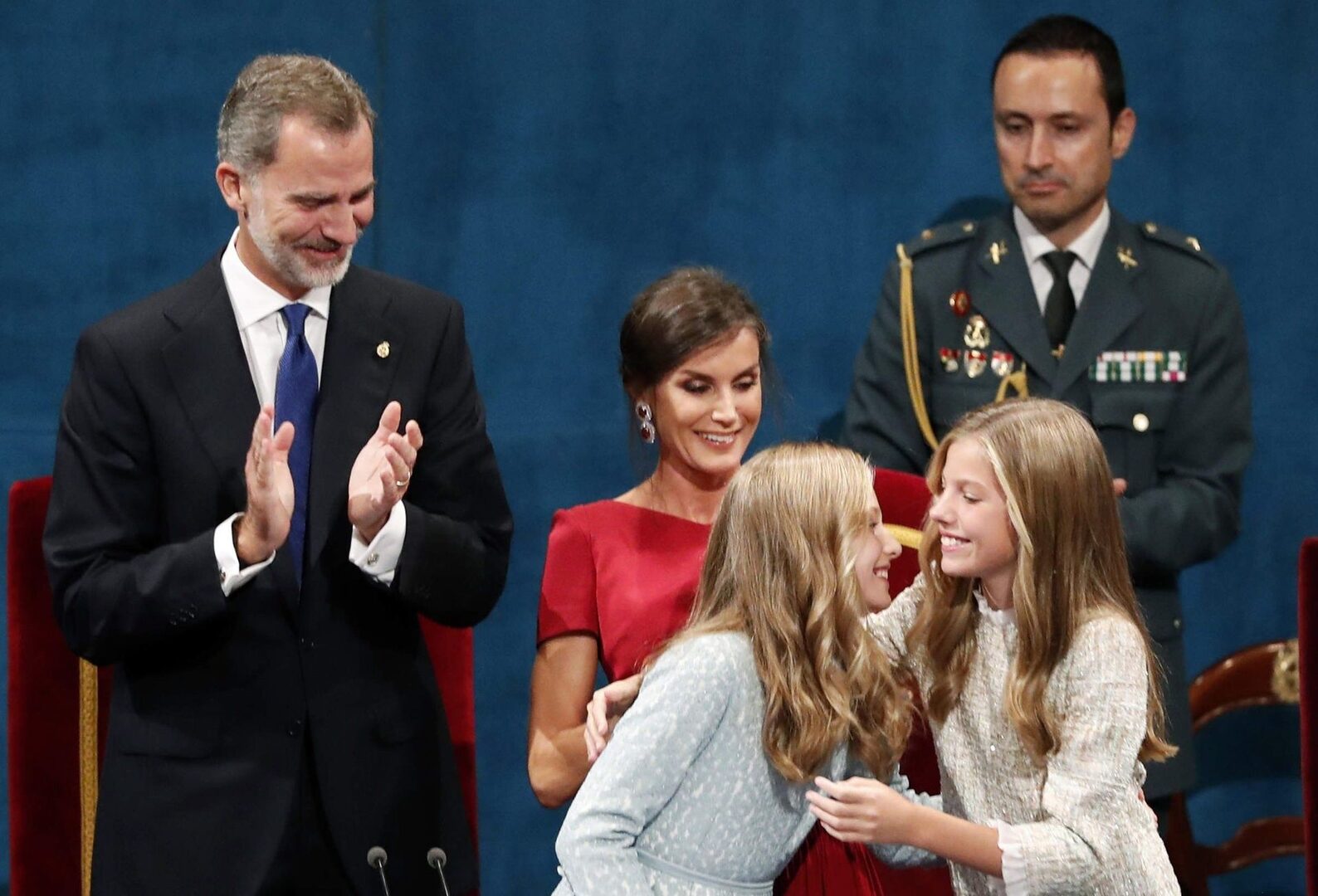 Pero decidí comentarles sobre Leonor y Sofía. Sobre las hermanas reales de España; adolescentes, que no se han prodigado mucho en público, aunque últimamente lo han hecho un poco más, debido a sus deberes: Leonor, en calidad de heredera del Trono, también como Princesa de Asturias y Princesa de Gerona, y Sofía como Infanta de España y hermana de Leonor. Resulta notable la inmensa complicidad que existe entre ellas, cómo se miran, cómo se sonríen simpáticas, y cómo durante sus presentaciones se reparten los saludos públicos para que todos salgan contentos de su asistencia. Ambas se protegen y se sostienen, producto sin duda alguna del amor que las une y de su excelente educación.