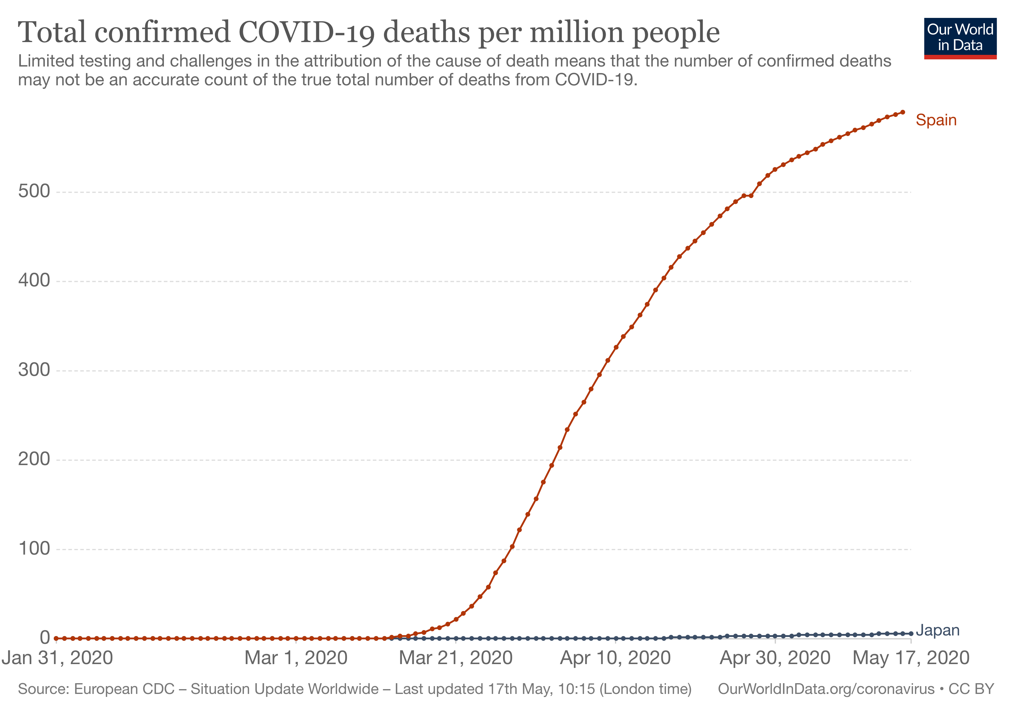 A día de hoy (18 de mayo), Japón (126 millones de habitantes) informa de 744 muertes por coronavirus. En total. Según las fraudulentas cifras oficiales, en España (47 millones de habitantes) ha habido más de 744 muertes diarias nada menos que en diez jornadas. Con sus fraudulentas cifras oficiales que demedian la mortandad, España reporta 591 muertes por millón de habitantes. Japón, el Japón que triplica la densidad de población de España y se las vio con el virus 15 días antes que España y que en casi todos los sentidos está mucho más cerca de la infecciosa China comunista que España, 6. Seis muertes por millón de habitantes. No hay errata.