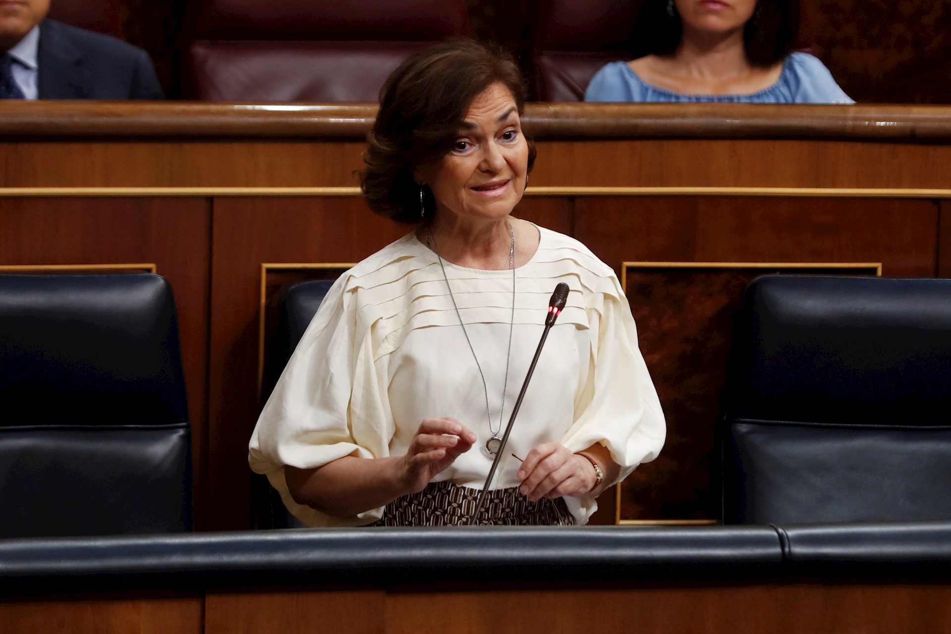"No hay que restituir lo que no ha existido"... Y se sentó la buena señora mecida por los aplausos de sus colegas y en la creencia de que había sido tan escueta como brillante, que le había dado al interviniente su merecido. Pobre, qué mal lleva la esgrima parlamentaria. Qué mal lleva en realidad hablar en público. Calvo es la misma Calvo del cocinera antes que "fraila", la de que el dinero público no es de nadie, la que suspiraba por que la Unesco pudiera legislar para todos los planetas. Y es la número dos del Gobierno, no una cheerleader de Jorge Javier. ¿De verdad no había en el PSOE nadie más capacitado?