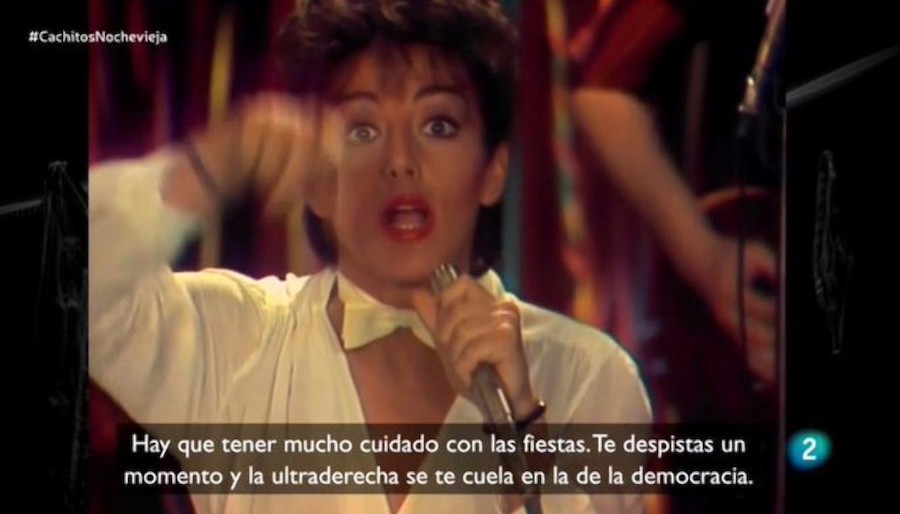 Después del atragante de Conguitos viene lo de los cachitos, que es uno de esos formatos tuiteros para televisión. Frases cortas, más o menos ingeniosas, ilustrando el despiece del ingente archivo de RTVE. Programa “de culto”, dicen los más entendidos. Tampoco lo veo (me estoy dando cuenta de que no veo nada y no sé si preocuparme), salvo los cortes que se hacen más virales. Normalmente por el lado político porque no basta con las campanadas y hay que tapar la bandera de España muy pasada la medianoche. Este año parece que con puño de hierro contra la oposición. No sé muy bien aunque a quién sorprende. Hay un momento donde una canción de Locomía, "Loco Vox", la utilizan para hacer el chiste con la formación de Abascal. Creo que es un gran favor el que le hacen a Vox con estas cosas, y si yo fuera Santiago Abascal hoy mismo salía con un abanico gigante bailando el tema, a la par que encargo carroza vinilada con un LOCO VOX enorme para los fastos del Orgullo 2021.