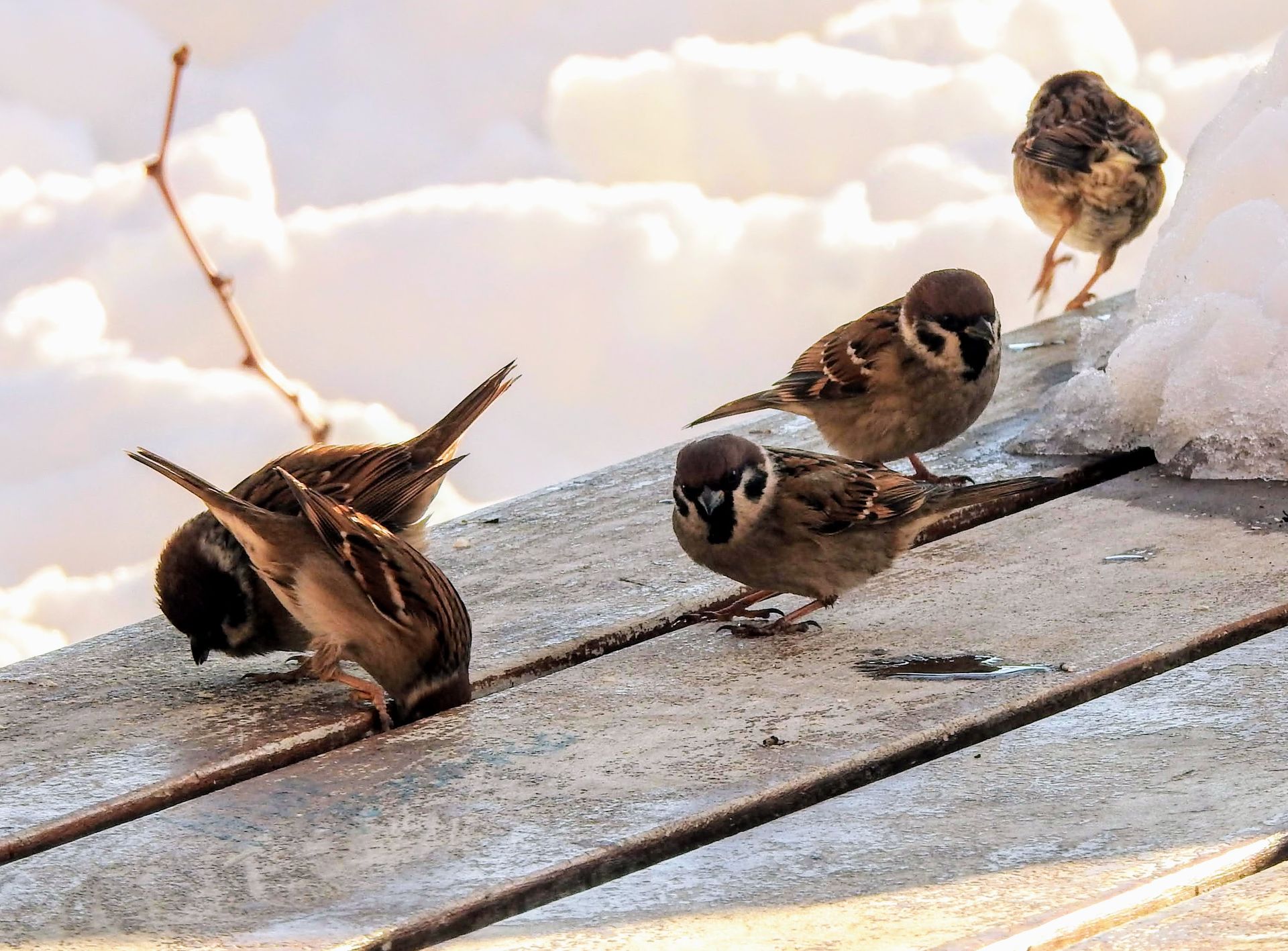 Los pájaros desconcertados ante el manto blanco en el que buscan desesperadamente comida suelen perecer durante la noche si fracasan en su búsqueda; unas simples miguitas de pan puestas estratégicamente en el alféizar de una ventana pueden permitirles sobrevivir en espera de que en la siguiente jornada la nieve haya comenzado a derretirse.