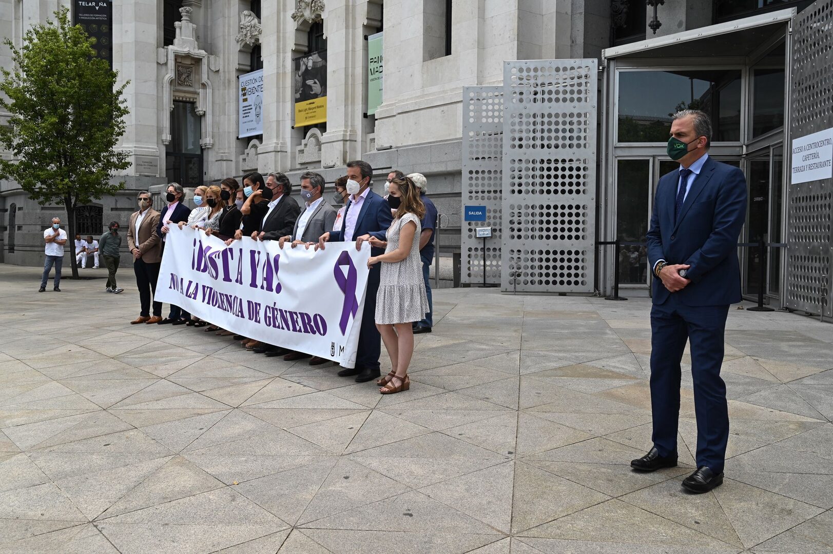 A unos pocos metros de Smith, los representantes de todos los demás partidos, incluyendo al alcalde Almeida, del PP, mostraban su repulsa a una parte de esos asesinatos detrás de una pancarta. En el color morado Podemos que todos los partidos menos Vox han aceptado para rotular sobre lo que antes llamábamos crímenes pasionales, la pancarta decía: "¡Basta Ya! No a la violencia de género".