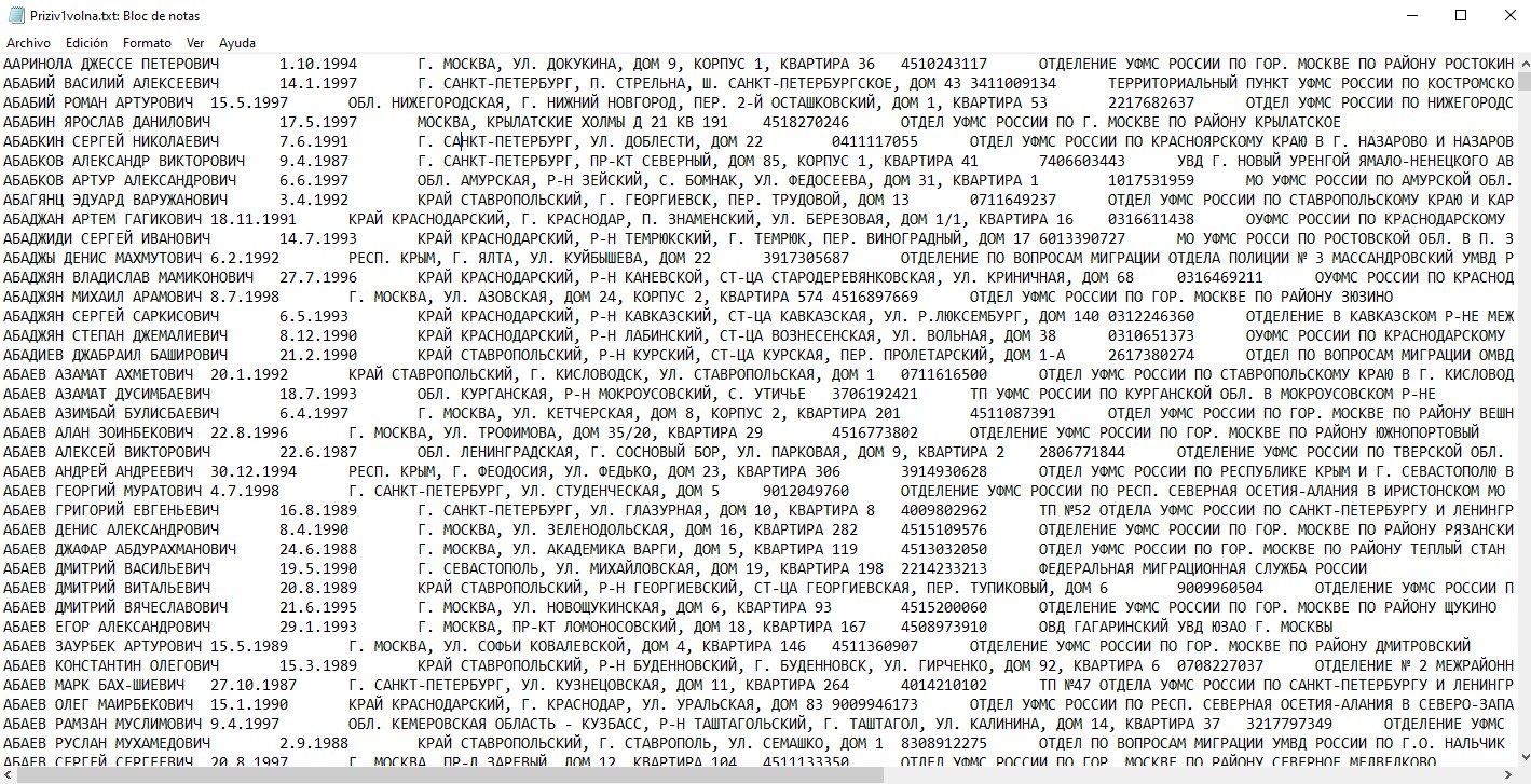 Este archivo filtrado incluye el nombre y los apellidos (el familiar y el patronímico, derivado del nombre de pila del padre), así como su fecha de nacimiento y la dirección que consta de ellos en la oficina de reclutamiento. Lo inicia Aarinola J. P., que vive en la calle Dokukina 9 de Moscú, y lo cierra Sergey V. Y., cuya vivienda está situada en el número 6 de la calle Lenskaya de San Petersburgo.