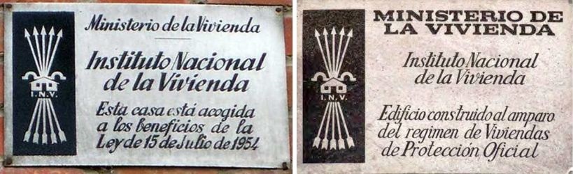 Otras posteriores eran más genéricas: "Edificio construido al amparo del régimen de Viviendas de Protección Oficial". En todo caso, el texto se acompañaba de un emblema ad hoc que combinaba el yugo y las flechas —los Reyes Católicos ya eran franquistas— con el icono de una casita integrada entre ambos elementos y las siglas I.N.V.