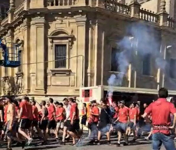 Ni Franco se atrevió a ordenar o inspirar que los hinchas del fútbol español de cualquiera de sus equipos y divisiones desfilaran militarmente por las calles de España. Por eso lo vivido horas antes de la final de la Copa del Rey en el centro de Sevilla, merece verse, pensarse y votarse en consecuencia, entre otras cosas más que el futuro nos dirá. No es fácil verlo porque, salvo Libertad Digital y algún tuitero suelto, nadie se ha hecho eco de la agresión proetarra a toda una ciudad, precisamente donde fueron asesinados Alberto Jiménez Becerril, teniente de alcalde del PP en el Ayuntamiento Sevillano y su esposa, Ascen García Ortiz hace veinticinco años.