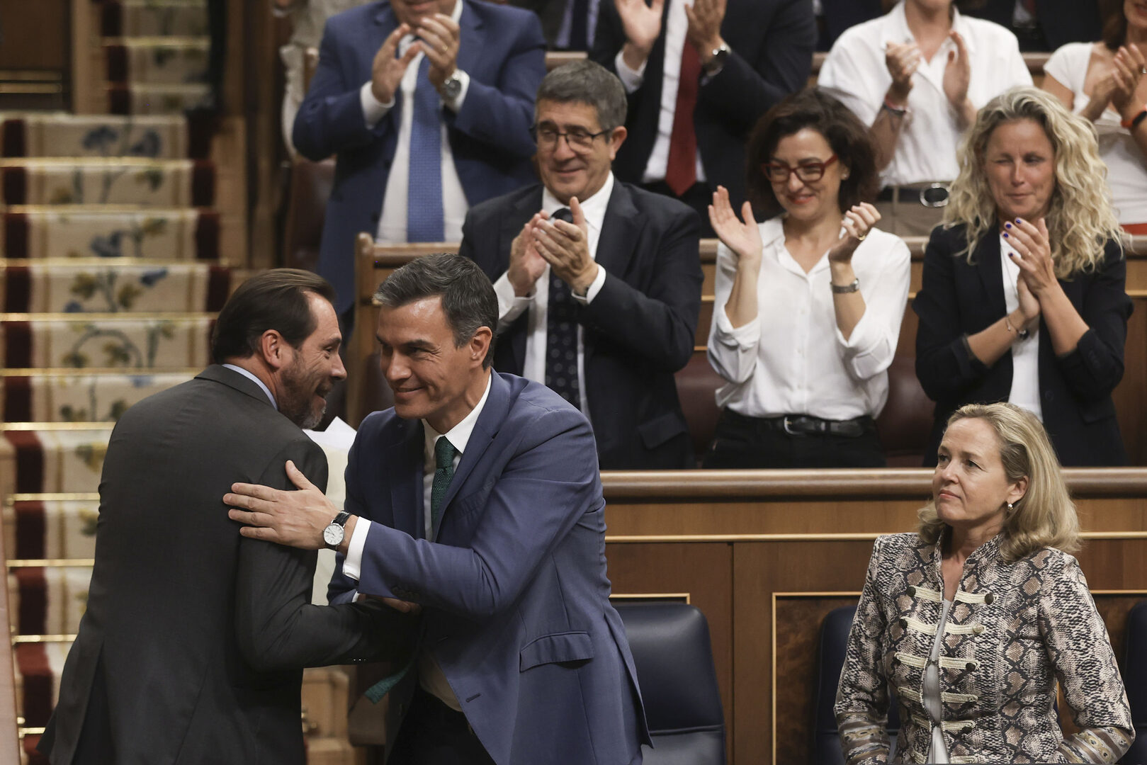 Previamente, Feijóo pronunció un discurso que duró una hora y tres cuartos. Rechazó la amnistía y el referéndum de autodeterminación, reivindicó la Transición, agradeció "a las señorías socialistas que me vean incapaz de pactar lo que ustedes van a pactar" y anunció la incorporación al Código Penal de un delito de deslealtad institucional y un incremento de "las penas de malversación de fondos públicos". Que "España será siempre una nación de ciudadanos libres e iguales" fue un estribillo recurrente. Garantizó que "no habrá imposiciones ni adoctrinamientos en las aulas" y se ganó una ovación tremenda cuando les preguntó a los "señores del PNV y de Junts" si "les han votado a ustedes para que se aplique la política económica de Podemos". Al concluir, la bancada popular le brindó un aplauso interminable. González Pons y Bendodo le agasajaron como los pastores de Belén al Niño Jesús.