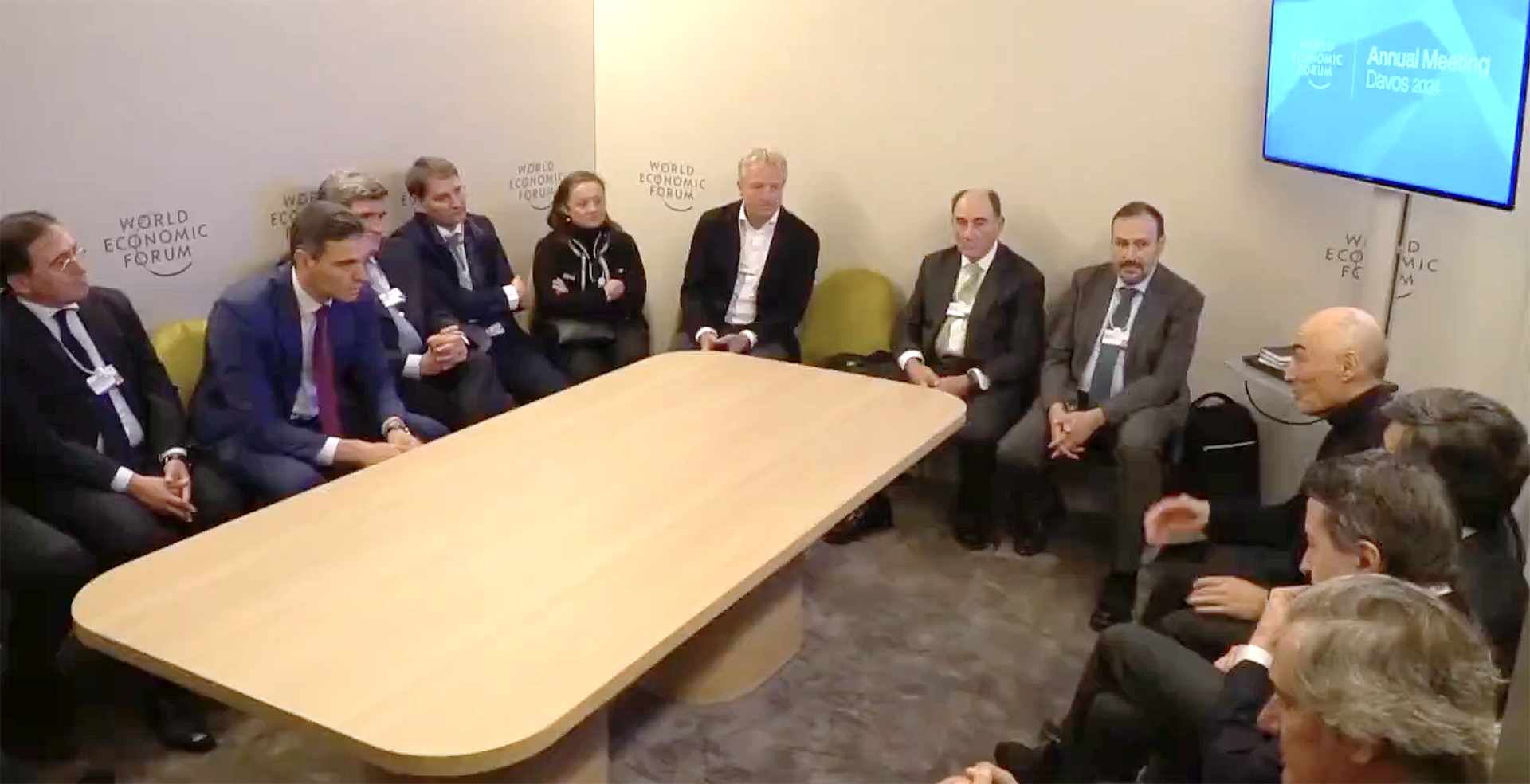 Los "consejos" de Sánchez en Davos se impartieron en una habitación del pánico con los empresarios sentados en sillitas de colegio pegadas a la pared. Sólo hay que ver la foto: literalmente, nada sobre la mesa. Ni un asunto, ni un vaso. La nada preside y la nada con mentiras clausura. Hasta el aplauso que trasladaron a la prensa fue mentira. Los ibexianos aplaudían, a petición de Carlos Torres (BBVA), al CEO de Cepsa Maarten Wetselaar, por haber merecido el premio "Best Vision of the Future 2024". Y uno de los mil y pico asesores del figurín pensó que ovacionaban al visionario socialista español.