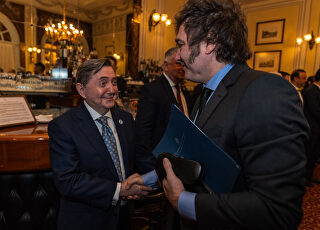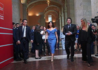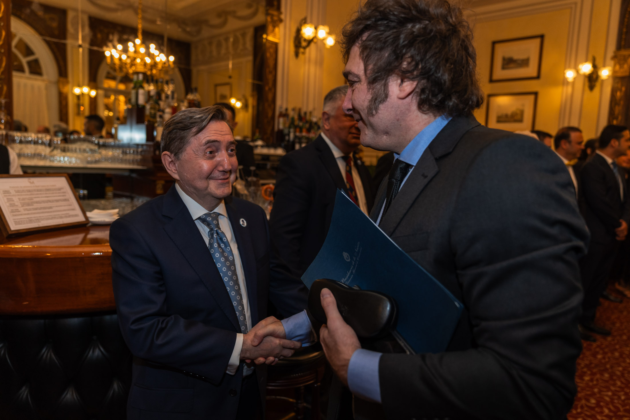 Además de famoso, Milei es el jefe del Estado de la República Argentina, lo que conlleva una ceremonia de saludos casi faraónica. En un reservado, que en realidad son dos salas, y después de esperar un buen rato su llegada desde la Puerta del Sol, nos alinean en una fila a los cuarenta principales, digámoslo así, de los casi cuatrocientos invitados. Me toca, cerca del final, tras Álvaro Vargas Llosa y Gerardo Bongiovani, que ya estaban en las Jornadas Liberales de Albarracín, con el gran Mario y Benegas Lynch (h) hace un cuarto de siglo, cuando nació el grupo Libertad Digital. En esa época, Milei, tras dejar la portería de Chacarita Juniors y crear un grupo tributo a los Rolling, se había puesto a estudiar economía en serio. Y ahora estamos aquí esperándolo todos. Al fin pasa con su cartera de profesor bajo el brazo, saludando y sonriendo, sin poder hacer mucho caso a nadie y deja una estela que recuerda el final de "Bienvenido Míster Marshall", cuando pasan los coches de los americanos a toda velocidad, dejando una nube de polvo y no paran en el pueblo, que tanto se había preparado para la visita.