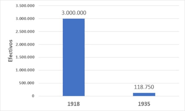 En 1918, el Ejército estadounidense contaba con casi tres millones de efectivos. En 1919 una comisión del Congreso propuso el Servicio Militar Obligatorio (Universal Military Training, UMT), pero durante la década de 1920 no se consideró necesario prepararse para un improbable conflicto; Peyton C. March señaló que "el país se había vuelto militarmente inoperativo". A la altura de 1935, una década y media de abandono había dejado al Ejército con menos de 200.000 hombres lo que implicaba que muchas unidades estaban en cuadro (figura 2); John McAuley Palmer precisó que "durante la guerra había ejércitos sin política y ahora hay política sin ejércitos".