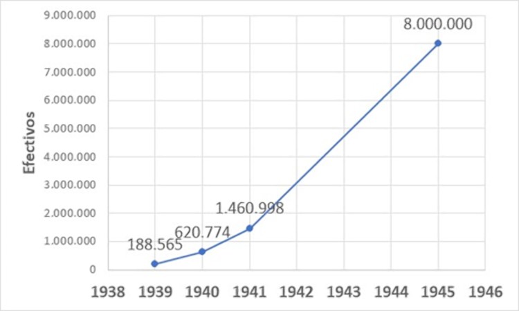 En marzo de 1940 "el 96% de los estadounidenses se oponían a la guerra" pero, tras la invasión de Francia "el 71% apoyaba el reclutamiento universal", lo que facilitó el proceso legislativo. La Ley Instrucción y Servicio Selectivo (Selective Training and Service Act) de 1940 establecía el servicio militar obligatorio de 12 meses, lo que permitió reclutar 630.000 efectivos mensualmente hasta alcanzar 1,4 millones en 1941 y 8 millones en 1945 (figura 3); Forrest Pogue señaló que "la conscripción hizo posible la enorme fuerza que luchó en la Segunda Guerra Mundial".