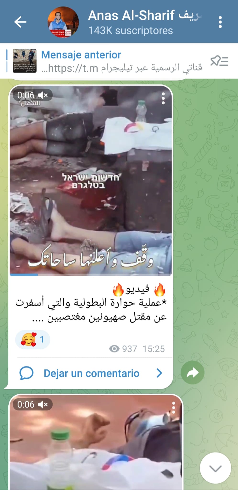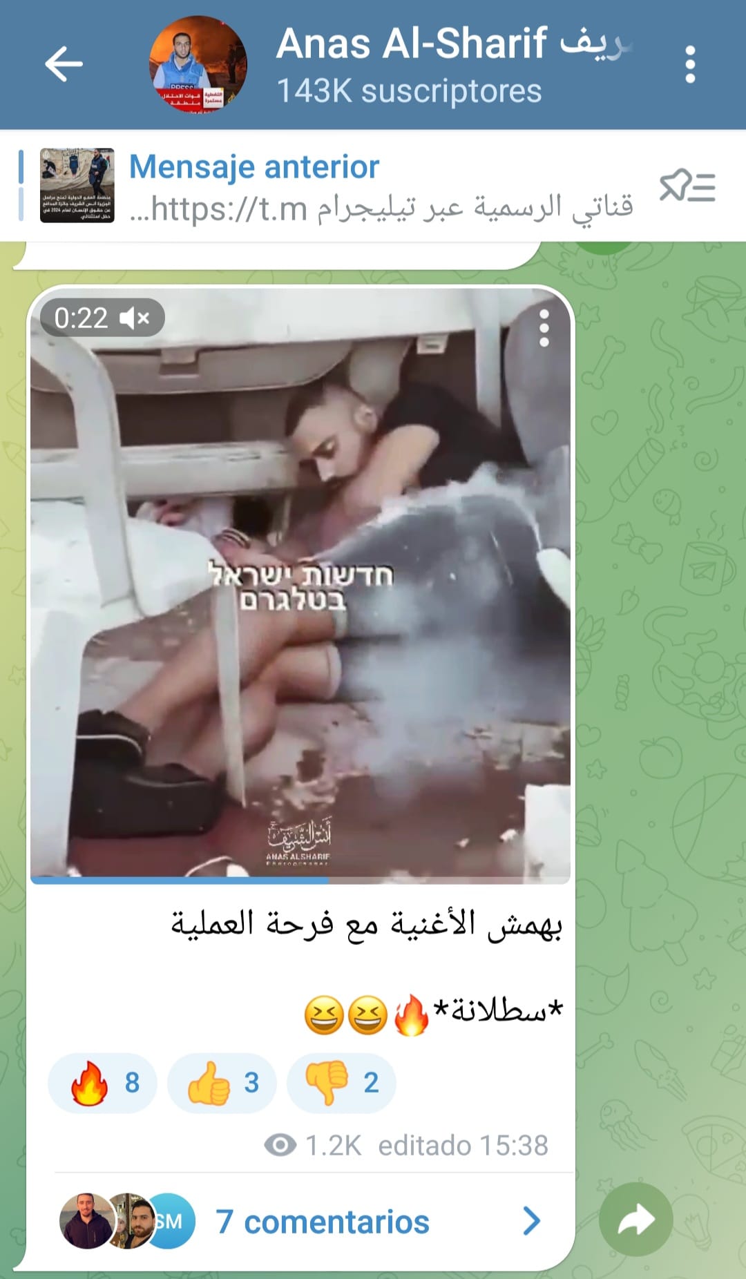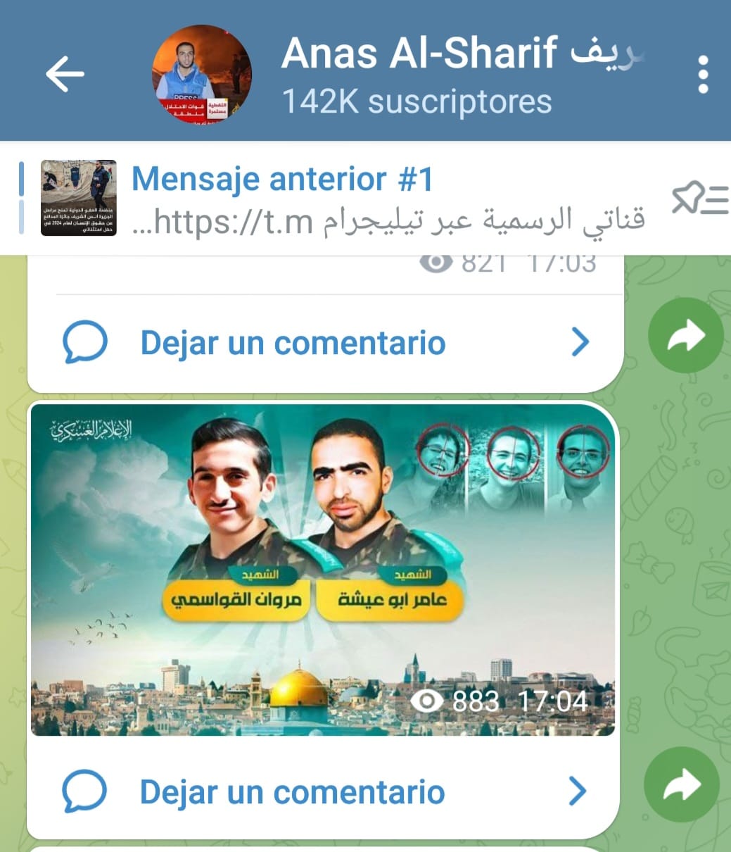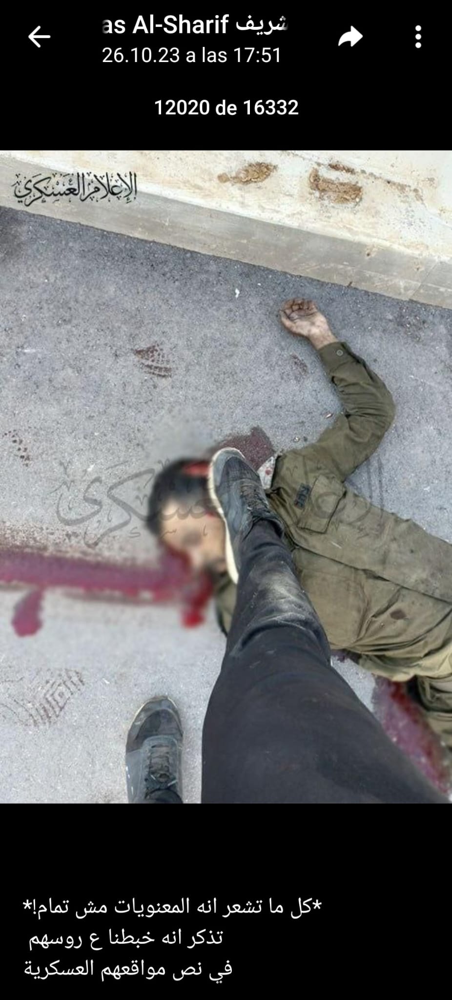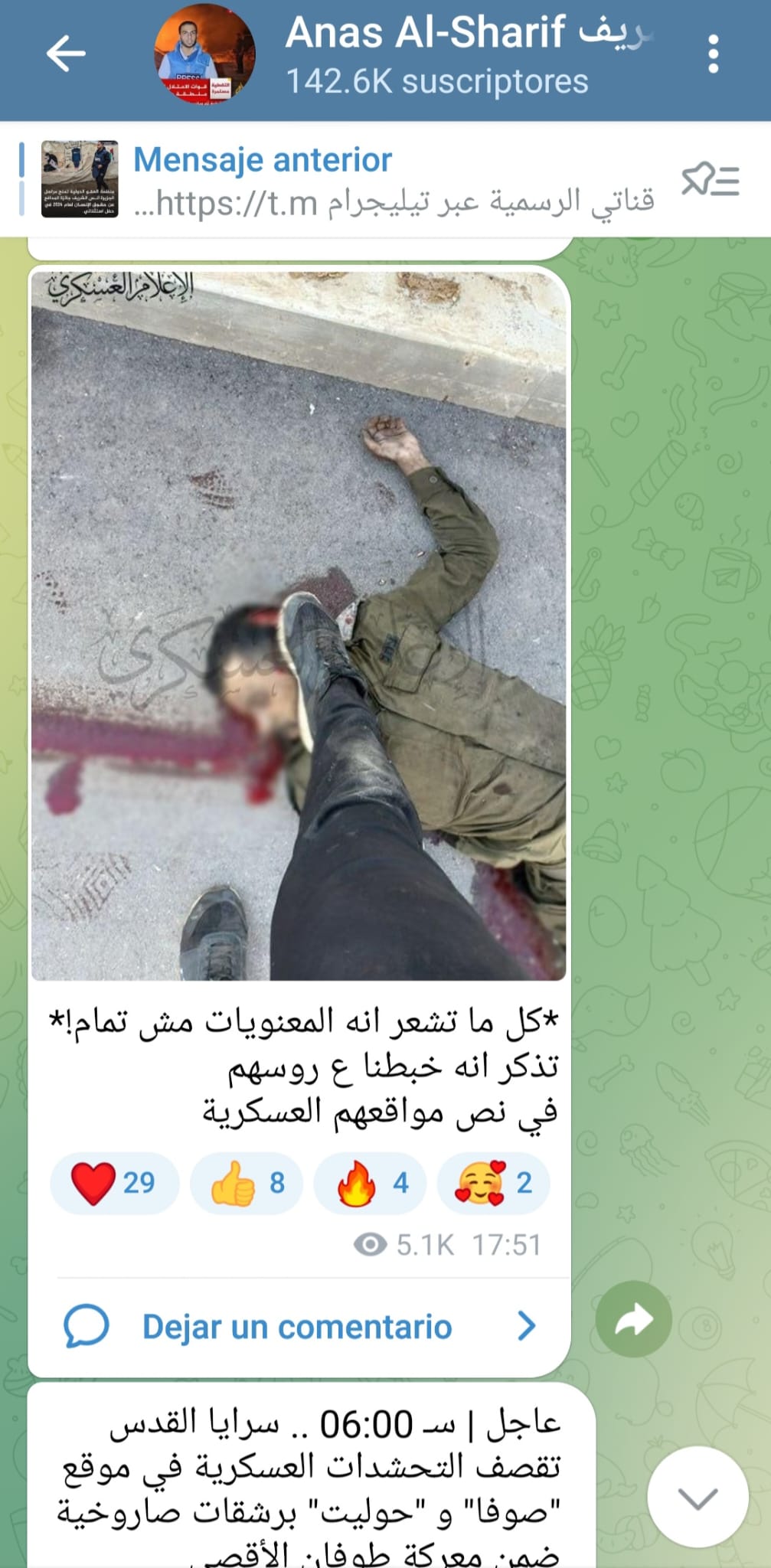 Los que describen a Al-Sharif como "la voz y la imagen que ha transmitido los horrores de la ofensiva israelí" y lloran su muerte en un bombardeo de las Fuerzas de Defensa de Israel, no se han tomado la molestia de mirar su canal de Telegram. Vayan al día 26 de octubre, 19 días después de la masacre terrorista de Hamás. Verán la imagen de un pie que pisa la cabeza de un muerto que yace sobre un charco de sangre. Lleva ropa militar y una etiqueta sobre el bolsillo izquierdo de su camisa revela que es un soldado israelí. El texto que acompaña a la imagen dice: "¡Cuando sientas que la moral no está del todo bien! Recuerda que golpeamos sus cabezas en la mitad de sus posiciones militares". Lo publicó Al-Sharif a las 17:51. ¿Les parece el mensaje de un periodista?