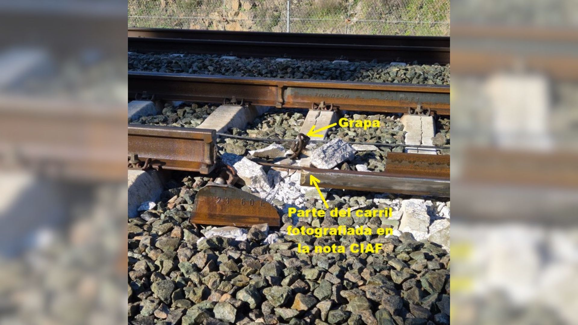 Junto al carril volcado y en toda su longitud, los únicos daños que se aprecian en las imágenes son grapas sueltas y hormigón destrozado por el arranque de esas grapas. Junto al carril izquierdo en el sentido de la marcha no se aprecia huella alguna de ruedas descarriladas pasando sobre traviesas y balasto.