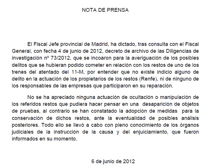 El 6 de junio de 2012, el fiscal jefe de Madrid, Eduardo Esteban, emitía una nota de prensa, de la que se deduce lo siguiente: