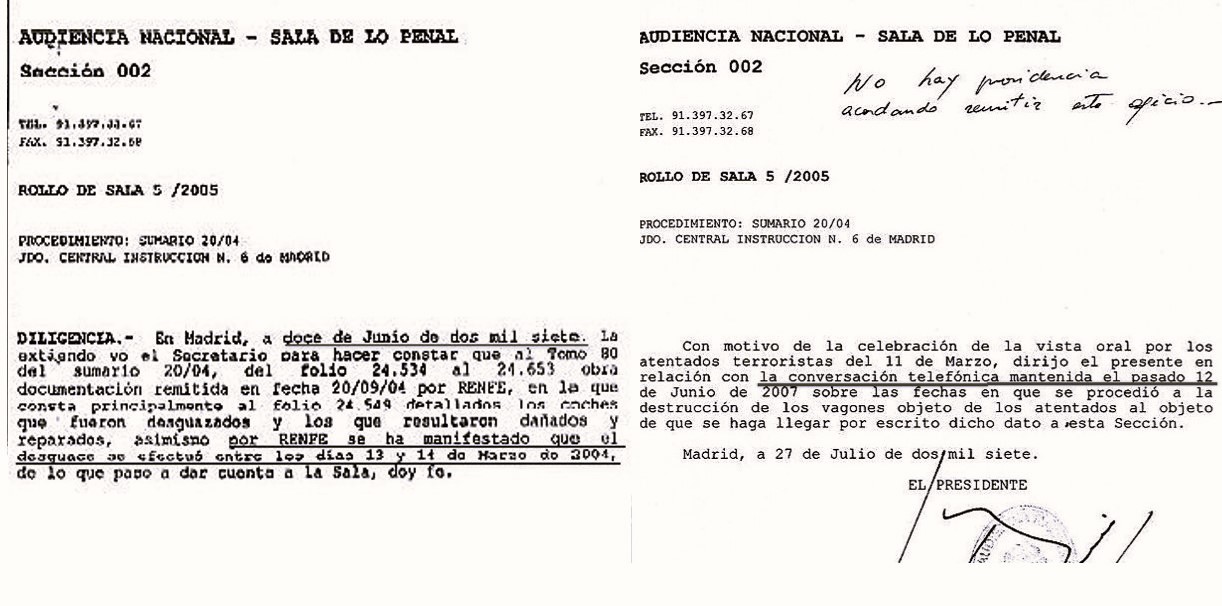 3 Así se dijo desde Renfe a la Audiencia Nacional, por teléfono, el 12 de junio de 2007, aunque ningún tren se desguazó en esos días. Sabemos que fue por teléfono porque así lo dice un escrito del Tribunal a Renfe pidiendo que diera por escrito el dato sobre las fechas dado en conversación telefónica del 12 de junio de 2007.