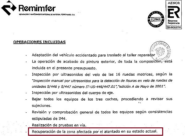1) En el presupuesto presentado por Remimfer para efectuar la reparación de ese tren, se añadió la siguiente coletilla: incluso 'recuperación' de la zona afectada por atentado 'en su estado actual'10.